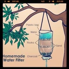 In an emergency you can also create your own water filtration system from charred wood from your fire, some sand and a cloth like a T-shirt.